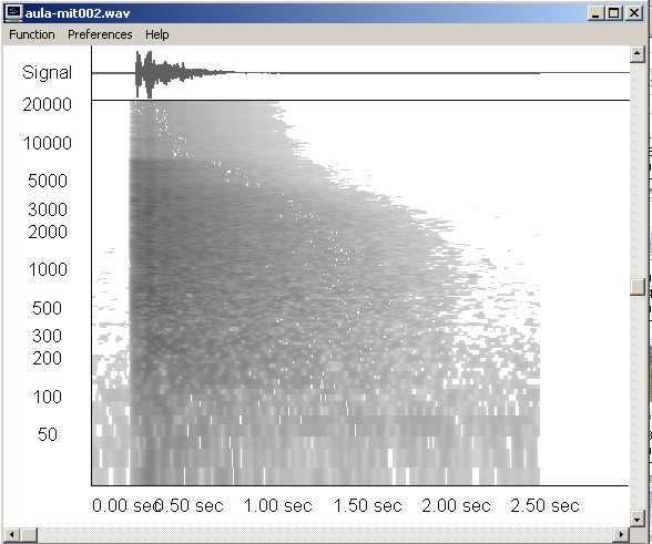die Zeit aufgetragen. Schuß mit Luftgewehr (ohne Projektil) Zustand ohne Vorhänge. (FB) frequenzanalyse Tondatei (Wave 170 kB) nur der Anfang der Datei aula-ohne006-kurz.wav |