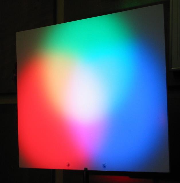 grün, rot). Das zusammengesetzte Licht wirkt