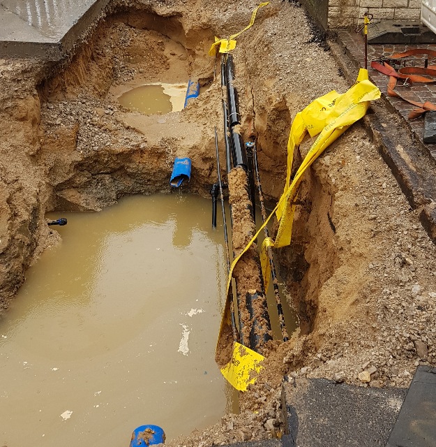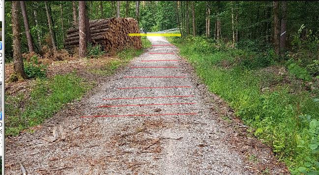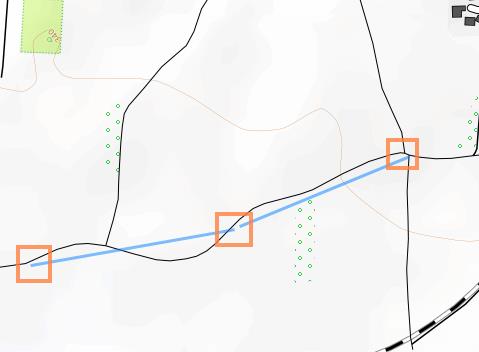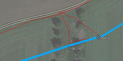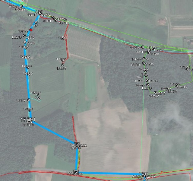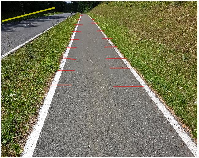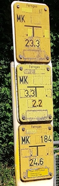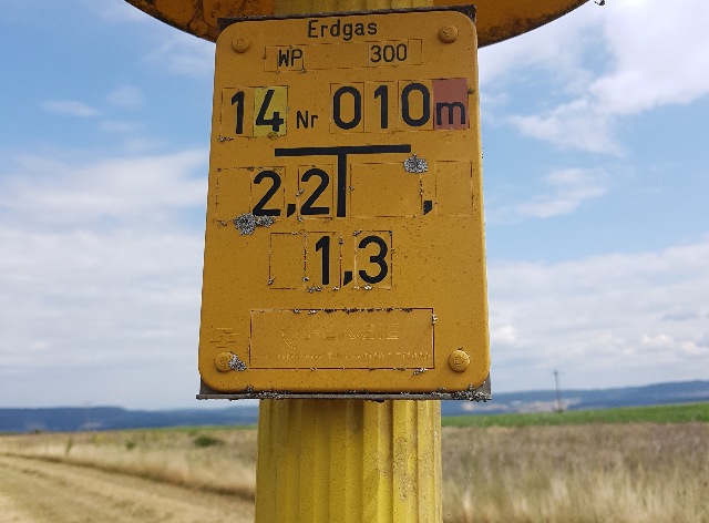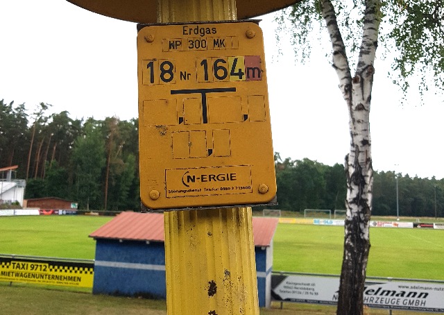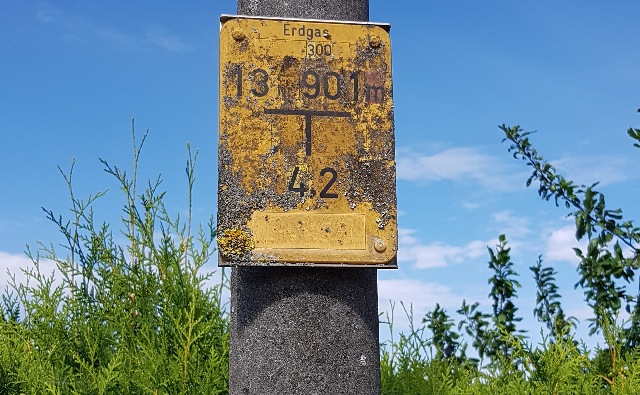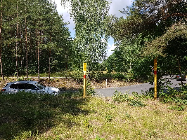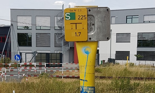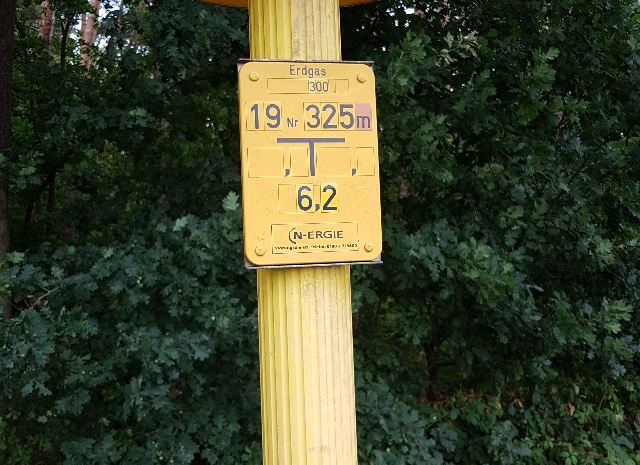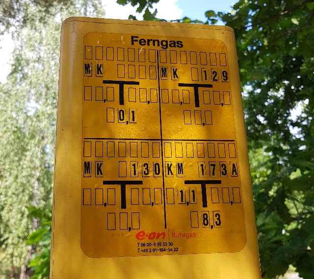 senkrecht dazu. rechts am Weg sind sechs Positionen mit Zweigen markiert, an der linken Seite drei Stellen. Sie gehören zum komplexen System aus Gas, Stahlrohr mit Kunststoffmantel (FB) |