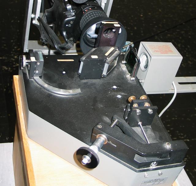 Beugungsbild (oben am Objektiv der Kamera). Schon kleinste Änderungen in der Geometrie im Bereich von Lichtwellenlängen haben einen Einfluß auf das Beugungsbild. Das Gerät läßt sich somit für sehr präzise Längenänderungen nutzen. (FB) |