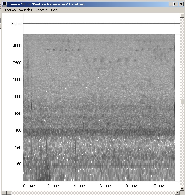 vorherige Diagramm bei 9,195 Sekunde. Bei rund 400 Hz und etwas weniger als 200 Hz liegen überwiegend die (Ober)-Töne der Flügel. (FB) |