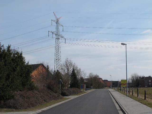Hochspannungsleitung steht im Bereich der Häuser. In der Wiese am
