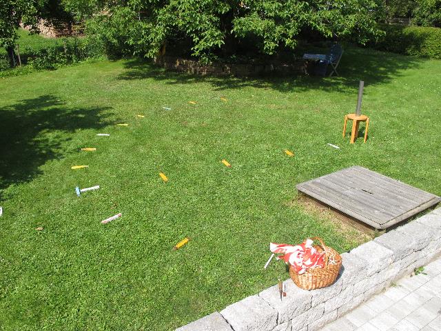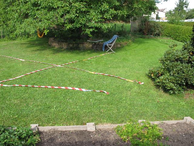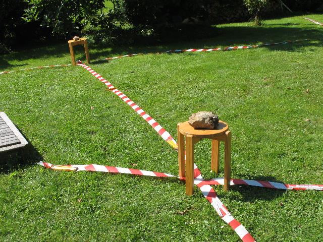 markierten Kreuzungspunkte. Protokoll der Experimente: Intensitäten und Fließrichtung der einzelnen Strukturen: (1) (4) : I = 2,3 (3) (4) : I = 2,0 (2) (3) : I = 3,1 (1) Abfluß I = 2,3 (2) Zufluß I = 3,0 und 2,0 (2) Abfluß I = 3,6, 2,0 und 3,1 Himmelsrichtung siehe Nordpfeil Einfluß von Steinen (Jura-Kalk) 1.1 Stein auf (4): die gemutete Information "Stein" ist auf allen Wasseradern (WA) zu spüren. 1.2 Stein zwischen (3) und (4): Information auf allen WA, aber verzögert und schwächer 1.3 Stein entfernt: Informationen verschwinden, auf WA (3)-(4) verzögert. 1.4 Stein auf (3): wie 1.1 1.5 Steine auf (1) und (3): Information beider Steine auf allen WA 1.6 ein Stein umgedreht: Intensität verändert. (FB) |
