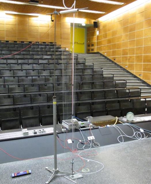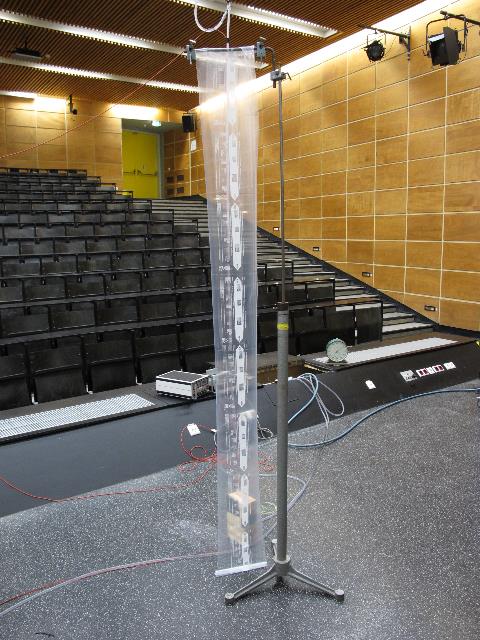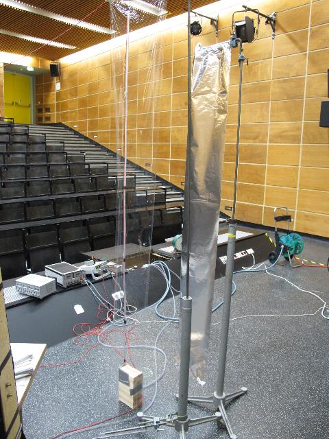 Wasser-Schlauch hängt eine Bahn der Haushaltsfolie. Die Leitung wird mit 2,2 Hz, 32 mA moduliert, es fließen 6,6 Liter Wasser pro Minute. Ohne Folie ist es unangenehm auch noch im Abstand von vier Metern von der Leitung. Hinter der Folie dagegen ist es gut auszuhalten. (FB) |
