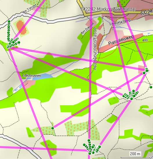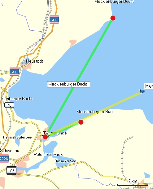 grüne Linie entspricht der Luftlinie. Die gefundene