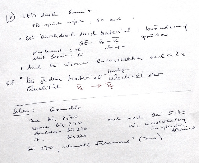 | Abb. 05-06-02: Notiz Reflektion des LED-Lichts an Hohlspiegel. Ergebnis: keine fokussierende Wirkung, Strahlung geht durch wie bei anderem Material Auch bei einem Hohlspiegel aus Messing: genauso FB hält Hand vor LED-Licht, Qualität hinter der Hand ist die gleiche wie bei Materialdurchgang v0 -> vT, Wasser |