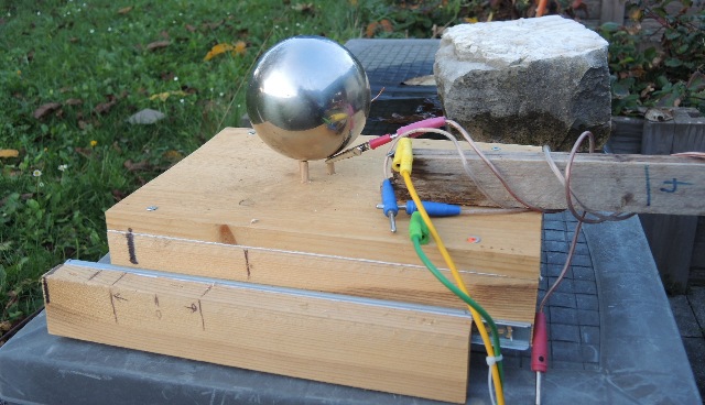 | Abb. 02-19: Unten kommen die beiden Leitungen von der Spannungsquelle, nach oben gehen sie zur Kugel. Die Gleichspannung ist zunächst erdfrei, wird aber duch den Zelthäring geerdet. Bei dieser Anordnung ist der negative Pol geerdet. Die Kugel liegt am Pluspol. (FB) |