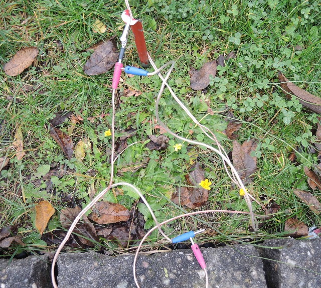 | Abb. 03-05: Meßgerät für die Spannung. Ein Pol ist an Erde ( Zelthäring im Boden) (FB) |