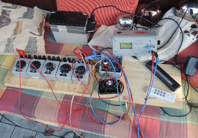| Abb. 02-15: Spannungsquelle zur Erzeugen einer kleinen Gleichspannung von einigen Millivolt, die per Funk aktiviert werden kann. von rechts nach links: USB-Akku (5Volt), Step-Up-Spannungsregler (von 5 V auf 10V), Wendel-Potentiometer 10 Umdrehungen, davor das Relais (geschaltet mit Funksender, es unterbricht die 10 V), Spannungsteiler 10 x 1000 Ohm bis 10 x 0.1 Ohm (aktueller Teilerfaktor 10000:0.1) (FB) |