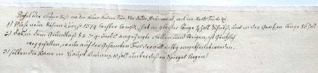 Calenberger Lachter = 1,919 m)1. Diese neue Röhren Tour, so 1374 Lachter lang, hat in 4 Lachter Länge 1/4 Zoll Schuß, und in der ganzen Länge 86 Zoll. 2. Das in dem Grundriß § 2,3,4 und 5 angezeigte Fallen und Steigen ist gäntzlich weggefallen, weiln auf der gesamten Tour der Fall richtig eingeteilt worden. 3. sollten die Röhren in Haupt Brunn 10 Zoll unter deßen Spiegel liegen (Stadtarchiv/Bauamt Clausthal) |