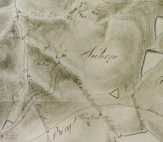 | Abb. 07: A Hirschler Teich, nordwestlich liegen die Gruben Dorothea und Caroline m Neue Benedicte Teich, c' oberer Kehrzuggraben mit Wasserlauf, λ Huttaler Wasserlauf, E Oberer Nassenwiesener Teich (H. Villefosse, 1822) |