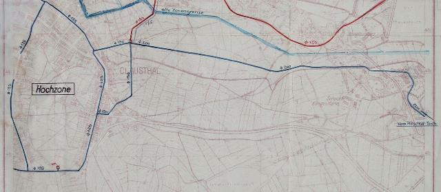 nördlich vom Zechenhaus. Grundriss von einer Neuen Wasserleitung Behuef der Bergstadt Clausthal aus den, neben dem Hirschler Teiche liegenden Haupt Brunn nach dem RahtsTeige zu, woraus zu ersehen. ..... Clausthal, den 8.Dezembr 1736, Samuel Rausch, |