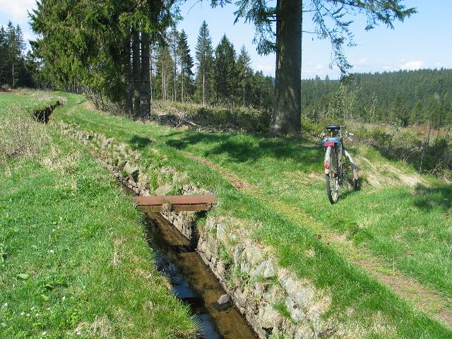 02:Zellerfelder Kunstgraben N51 49 37.9 E10 20 38.9. Hier floß aus dem Stahlrohr früher Wasser vom Pumpwerk am Stadtweger Teich (N51 49 44.8 E10 20 51.6) Daneben überquert eine Kabelbrücke den Graben. Startpunkt für die Suche der elektrischen Leitung. (FB) |