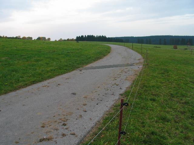 verlaufen mehrere Leitungen: Trinkwasserleitung Kunststoffrohr (links), ehemalige Trinkwasserleitung Eisenrohr (rechts), Stromversorgung für Pumpwerk Das Foto zeigt den Waldweg nach den Kabelarbeiten im Sommer 2007. N51 50 04.2 E10 21 20.5 (FB) |