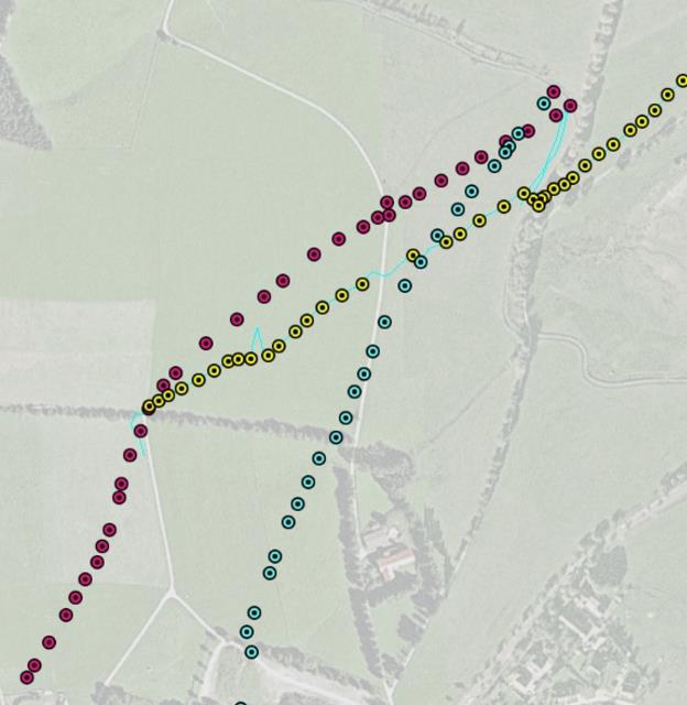 Verfolgung einer Spur (Kabel?) am 21.3.2009. schwarz: Spur des Weges, grün: augenommene Markierungen über dem Kabel? Der nördlichste Punkt trägt die Nummer 258, siehe Tabelle unten. Die violette Strecke gilt als Maßstab: 1000 Meter. Links unten: Standort der beiden Windgeneratoren auf der Bockswieser Höhe. Im nördlichen Bereich wurden wegen des Schneefeldes keine Markierungen gesetzt. Im Bereich des kleinen Wäldchens unten ist das Gelände etwas unwegsam. Bäume und Zäune mit Stacheldraht. Gehzeit rund 30 Minuten. kabel-untermuehle-teil01.kmz und die Wiederholung am 10.4.2009 führt zu ähnlichen Ergebnissen. kabel-untermuehle-teil02.kmz (FB) |