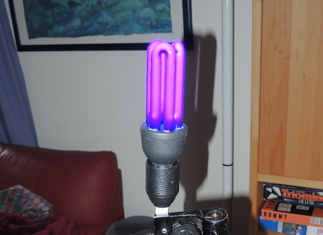 | Abb. 04-06a: Schwarzlichtlampe in der Bauform einer Energiesparlampe. Der Leuchtstoff produziert weniger Licht im sichtbaren Bereich, dafür mehr im nahen UV-Bereich. (FB) | |