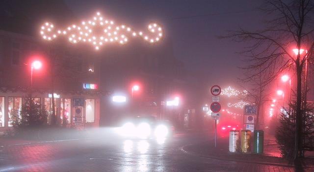 hinter einer Dunstschicht, es schneit ein wenig. Im