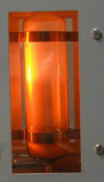 bei zu hoher Spannung betrieben. Der Glühfaden ist durchgeschmolzen und es brennt danach eine Gasentladung zwischen den Anschlußdrähten. Die Drähte schmelzen ab und hinterlassen am Glassockel kleine Metallkugeln, von denen aus die Gasentladung weiterbrennt und dabei das Glas dort so erwärmt, daß es leitfähig wird. Jetzt fließt der Strom durch das Glas, erwärmt es und bringt es zum schwachen Leuchten. Dabei schmilzt es und der Stempel neigt sich zur Seite. Das Innenwiderstand im Netzteil begrenzt den Strom und verhindert einen Kurzschluß. Dieser Effekt tritt nur auf, wenn im Glaskolben die richtige Gasmischung vorhanden ist. (FB) |