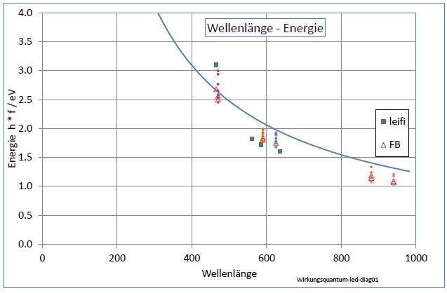 | Abb. 03-03: Durchlaßspannungen bei LEDs unterschiedlicher Farbe Dreiecke: Strom 1 mA, kleine Punkte: Ströme jeweils ansteigend bis etwa 20 mA grüne Karos: gemessene Werte übernommen von leifi https://www.leifiphysik.de/quantenphysik/quantenobjekt-photon/versuche/h-bestimmung-mit-leds Die bei den LEDs für die spezifische Wellenlänge erforderliche Energie in eV ist bei den meisten Werten zahlenmäßig etwas größer als die tatsächlich angelegte Spannung in Volt. (FB) |