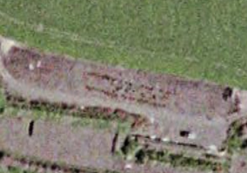 zum Bau der B6n (Pfosten eines Hauses) nachgebaut. Im interaktiven Luftbild in der Fassung vom August 2009 sieht man die Baustelle dieses Parkplatzes vor Beginn des Straßenbaus. Archäologen sind bei der Arbeit und graben in der Geschichte des Landes. Im Anschluß nach Osten scheinen sie die Pfostenlöcher eines Objektes bei der nördlichen Spur gefunden zu haben. (FB) |