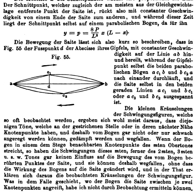 | Abb. 02-09: Schwingung einer gestrichenen Saite. Es läuft ein Dreieck herum. H. v. Helmholtz Die Lehre von den Tonempfindungen 1865 - Seite 579 |