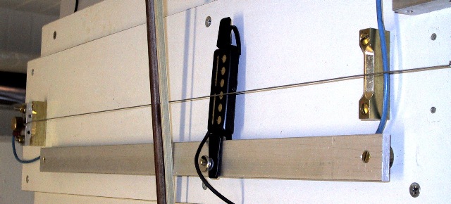 | Abb. 02-01: eine Saite wird mit einem Bogen gestrichen, rechts daneben ist ein Tonabnehmer für Guitarren. Sie wirkt wie ein elektrischer Generator (FB) |