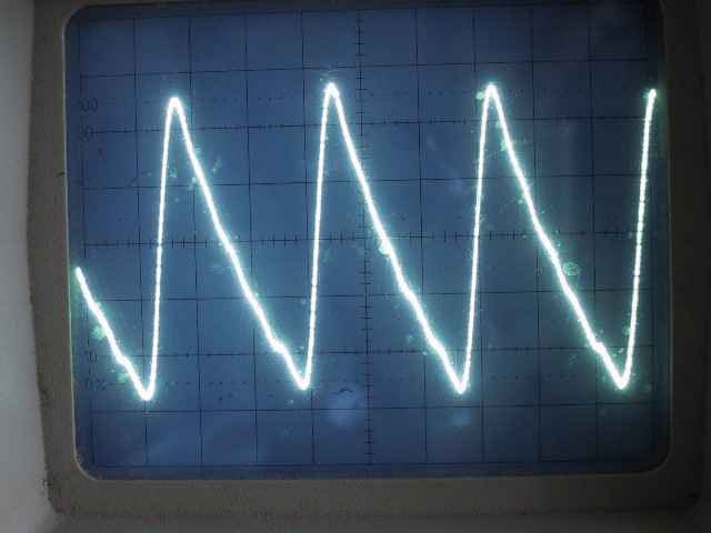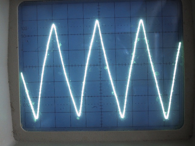 Zum Vergleich: gerechnete Dreiecksschwingung, gleiche Frequenz, symmetrisches Dreieck, Sägezahn siehe auch frequenz-synthese Abb. 03 |