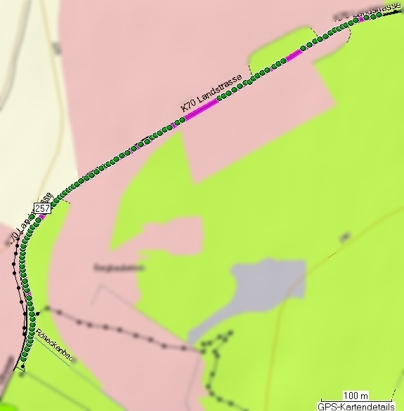 K70. Von rechts am Bildrand kommt der Röseckenbach und unterquert die Straße nach links zum Fabrikgelände. Die Autofahrer überfahren in dieser Kurve daher zwei unterschiedliche Typen von Störzonen. (FB) |