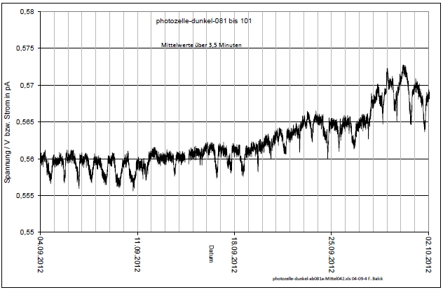 ohne Beleuchtung. Dauer: 5 Tage schwarz: original Meßdaten, rot Mittelwerte über 3,5 Minuten. Es gibt eine periodische Struktur im Verlauf der Messung über etwa 5 Tage (FB) |