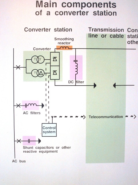 | Abb. 02-00: Die Umrichterstation von der Trave aus gesehen. Rechts vor dem Gebäude kommt das Gleichspannungskabel an. Links geht die Wechselspannung über die drei Leiter weiter in das Netz. (FB) |