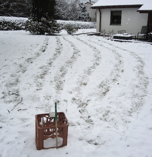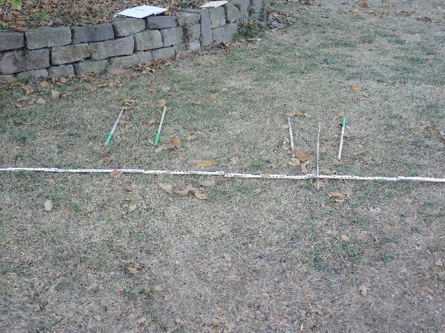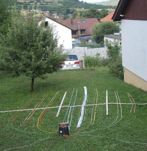 | Abb. 07-18: Die Strukturen bei kurzer und langer Entfernung: Im Hintergrund beim roten Wäschekorb ist der Startpunkt mit Stein Nr. 4. Die rote Schnur zeigt von dort in Richtung zum Stein Nr. 3 bei langer Entfernung. Die blaue markiert die Lage der kurzen Verbindung. Jeweilige Breite und Lage der sechs Elemente des Sixpacks sind mit Hölzern ausgelegt. (FB) |