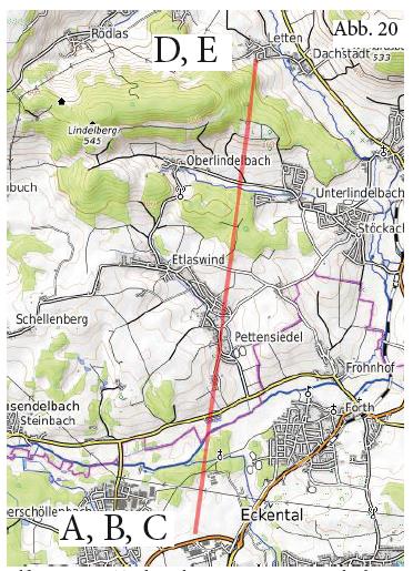 | Abb. 06-02: Der Track wurde von Eckental nach Letten gelegt. Startpunkt war zunächst bei B, Zielpunkt lag bei D. (opentopomap.org) |
