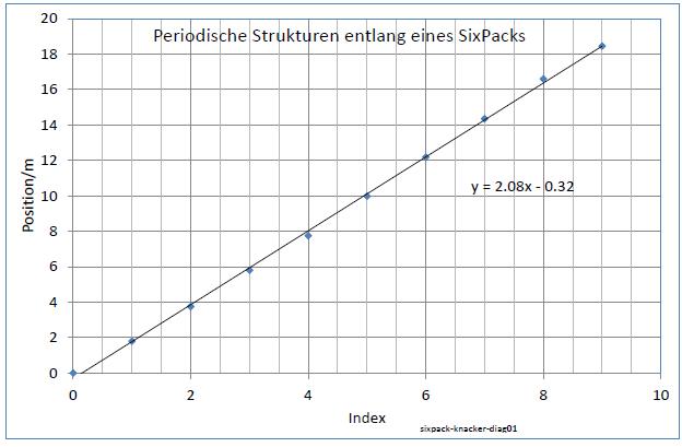 | Abb. 07-13: Periodische Strukturen auf dem 18,5 m langen Sixpack. Die Ausgleichsgerade zeigt eine mittlere Länge von 2,08 m. (FB) |