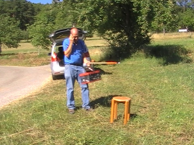 | Abb. 03-06: Telefonkontakt zum Beobachter am Zielpunkt. Auf den Hocker wurden Briefumschläge mit unterschiedlichen Substanzen gelegt und gewartet, bis die "Information" am Ziel zu spüren war. Der Ton des Telefonats wurde bei laufender Videokamera mit aufgezeichnet. Daraus ließ sich anschließend die Zeit bis zur Quittung des Beobachters "ist angekommen" bestimmen. (FB) |