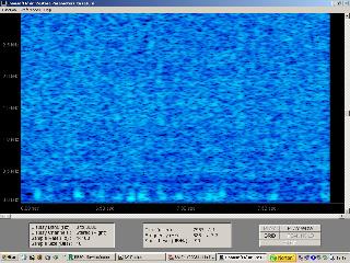 Abb. 07: Frequenzspektrum, starker Regen, 1. Achse (rechts): 25 kHz pro Teilung, 2. Achse (oben) Mikrofonsignal logarithmisch /db Im Bereich oberhalb von 15 kHz bis 75 kHz ist noch deutlich Intensität vorhanden. (FB) |