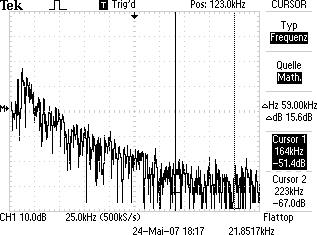 | Abb. 06: Frequnzspektrum der "Stille", 1. Achse (rechts): 12,5 kHz pro Teilung, 2. Achse (oben) Mikrofonsignal logarithmisch /db (FB) |