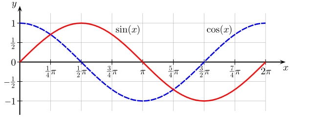 Maximalwert, sie sind nicht in Phase. https://upload.wikimedia.org/wikipedia/commons/7/71/Sine_cosine_one_period.svg |