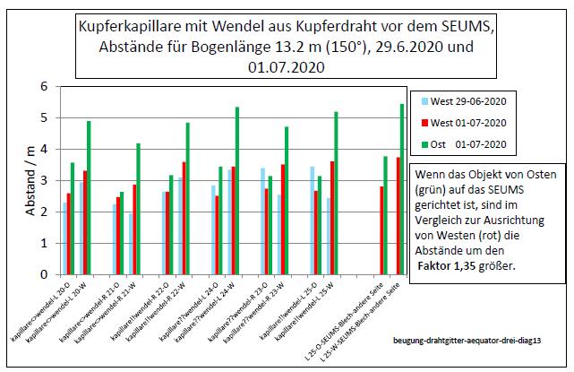 | Abb. 03-18: Abstände für Bogenlänge 13.2 m (150°) als Maß für die "Intensität" der verschiedenen Blechstreifen. von links nach rechts: 1) R und L in Längsrichtung, links tordiert ist stärker als rechts tordiert. 2) 1 quer und 2 quer, keine Unterschiede an beiden Enden 3) 1 quer und 2 quer nebeneinander, hintereinander. Es gibt starke und schwache Anordnungen. 4) nach dem Glühen nimmt die Intensität ab, beide Enden sind dann gleichwertig. 5) 9 längs, 8 längs, einzeln, bei Anordnung nach Osten ist es stärker als nach Westen. beide nebeneinander oder hintereinander erhöhen die Intensität bzw. bei antiparallel verschwindet die Intensität 2 längs, längerer Streifen, West stärker als Ost zusammen mit 8,9 in Reihe ergibt sich die höchste Intensität. 6) 3 quer rechts tordiert und 4 quer links tordiert, geringer Unterschied bei Ost und West, bei parallel bzw. in Reihe gibt es Abschwächung | ||||||||||||||||||||||||||||||||||||||||||||||||||||||||||||||||||||||||||||||||||||||