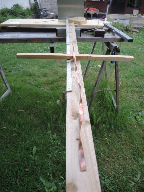 | Abb. 01-08: Ein gebogenes Blech aus Titan-Zink (von der Rolle) https://de.wikipedia.org/wiki/Titanzink Das Blech macht eine Linkskurve, im Hintergrund auf dem Rasen sieht man den Meßkreis. Vorne am schwenkbaren Holzbrett ist eine Skala für die Winkelverstellung, plus/minus 7° Die Holzstäbe auf dem Rasen zeigen die Breite der Struktur bei einem geraden Aluminiumblech an. (FB) |
