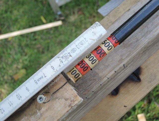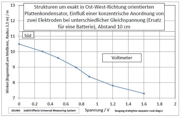 Westseite des Meßkreises. Bei der Polung der angelegten Spannung ergibt sich jedoch ein unsymmetrisches Bild. Die Marken außen mit dem geringen Abstand gehören zu der Anordnung Minuspol im Westen, Pluspol im Osten, die Marken innen zu der Anordnung Pluspol im Westen, Minuspol im Osten. (FB) |