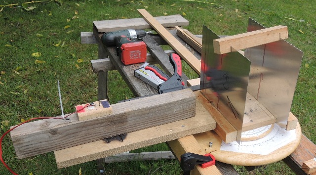 | Abb. 01-01: Der Detektor, der "Empfänger": Zwei Aluminiumplatten (20 cm x 20 cm) sind auf einem Drehtisch parallel angeordnet. Sie sind exakt in der Nord-Süd-Richtung ausgerichtet. Für das Experiment sind die zwei parallelen Grenzflächen entscheidend. Richtet man einen feinstofflich aktiven Körper auf den Detektor, so wird er angeregt und es verbreitern sich die spürbaren Strukturen um den Detektor herum. Deren Ränder kann man auf dem Boden markieren und anschließend ausmessen. Bei allen Anregungen kommt es natürlich auf den Abstand zu den Aluminiumplatten an. Es gilt: Je kleiner der Abstand ist, um so größer ist die Anregung. Für eine absolute Messung ist dies von Nachteil, aber bei Relativmessungen kann es von Vorteil sein, weil sich über den Abstand die Empfindlichkeit anpassen läßt. (FB) |