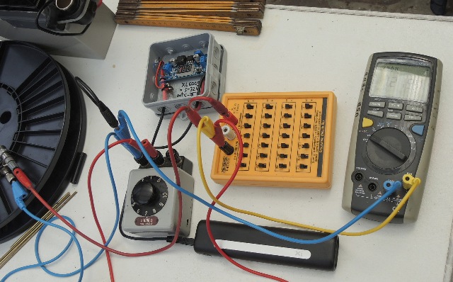 Gerät in der Mitte vom großen Meßkreis. Die unterschiedlichen Meßmarken gehören zu den verschiedenen Einsatzmöglichkeiten. Die blaue und rote Schnur verläuft parallel zur Nord-Süd-Richtung (am Bildrand unten ist Süden). Die vier Skalen des "Multimeters" bedeuten: links unten: