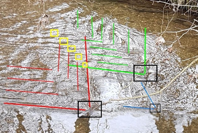 nach rechts. Natürliche Hindernisse im Bach erzeugen eine Kette von "Wirbelkreuzungen" Flow from left to right. Natural obstacles in the stream create a chain of "vortex intersections". (FB) |