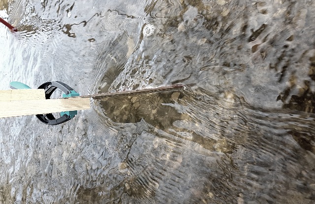 Versuch. Die Linie zwischen beiden Pfosten ist senkrecht zur Strömungsrichtung. Damit kann sich ein symmetrisches Muster auf der Wasseroberfläche ausbilden. Etwa in der Bildmitte ist der erste Schnittpunkt der V-förmigen Randstrukturen ("Wirbelkreuzung"). In Strömungrichtung weiter nach rechts gibt es weitere nahezu ortsfeste gleichartige Punkte. Two red iron posts give defined conditions for the same experiment. The line between the two posts is perpendicular to the direction of flow. This allows a symmetrical pattern to form on the water surface. Approximately in the center of the picture is the first intersection of the V-shaped edge structures. ("vortex intersection") Further to the right in the direction of flow, there are other nearly stationary similar points. (FB) |