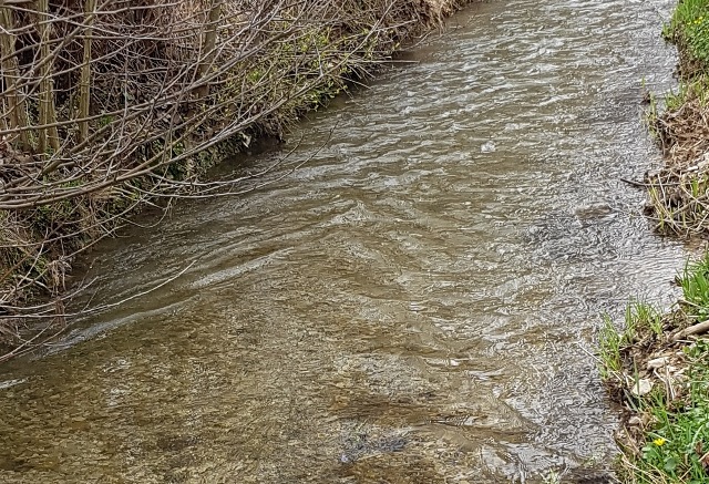 Wasser über eine schwache Gefällestrecke. On a stream flowing from left to right, there is a small impoundment on the left of the picture. From there, the water flows over a weak downward slope. (FB) |