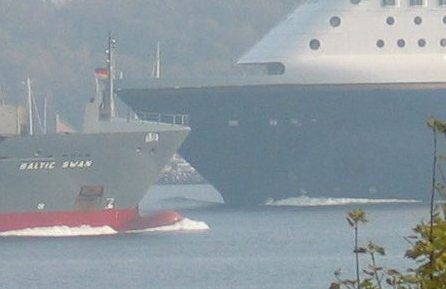 roten Wulstbug, dahinter auch vor dem blauen Schiff.