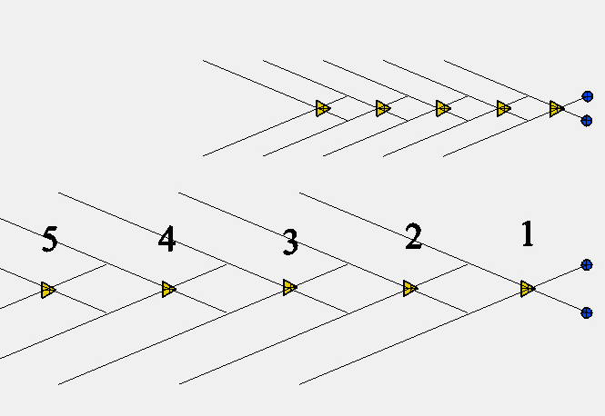 Abstand der Kreuzungspunkte (gelb). As the distance of the obstacles (blue) increases, so does the distance of the crossing points (yellow). (FB) |
