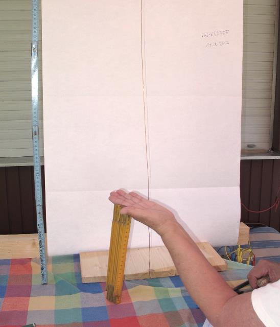 Abb. 01-02: Der Draht hängt vor eioem weißen Papierstreifen von oben herab, unten ist er mit einem Holzbrett beschwert. Die Zuleitung von oben hat die Farbe rot, die von unten schwarz. Der elektrische Kontakt erfolgt über vernickelte Krokodilklemmen. (FB)