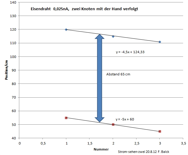 Auch ohne den Beobachter A.S. ließ sich bestätigen, daß sich entlang des Drahtes Objekte bewegen und zwar in gleicher Richtung wie der technische Strom fließt, d.h. von plus nach minus.