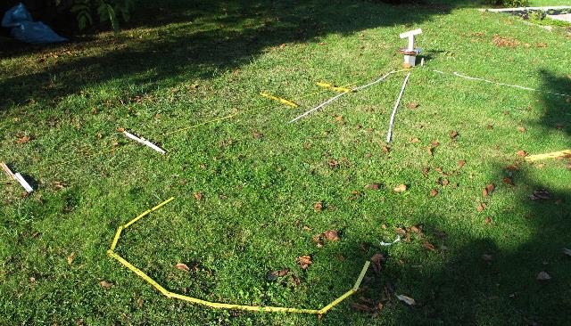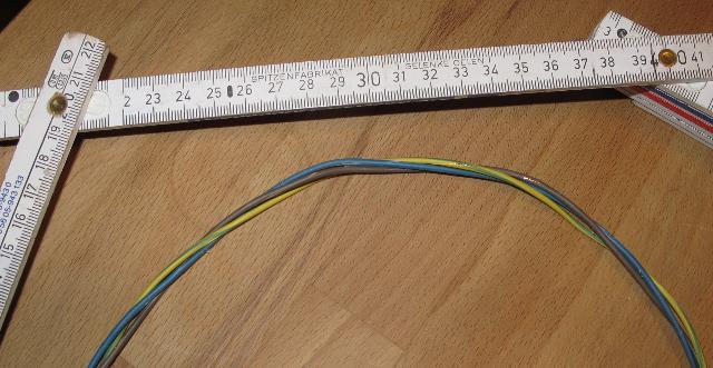 Kabel, dreiadrig, 230 Volt Wechselstrom. Um das Kabel herum findet man konzentrisch vier spürbare Zonen. Die Radien sind 6 cm -13 cm; 24 cm - 33 cm; 050 cm - 58 cm; 78 cm - 87 cm. In Längsrichtung sind die Zonen abschnittsweise (Länge 1,2 m) eingeschnürt. (FB) |
